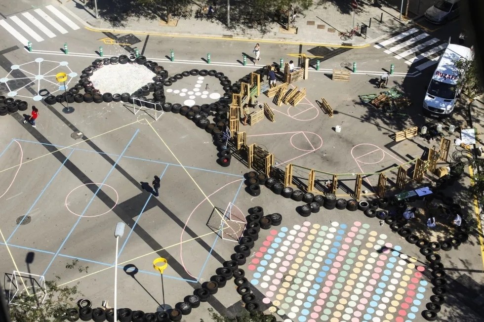 Exemple de réappropriations temporaires des rues d'un superbloc de Barcelone, cet espace était à l'époque un carrefour très encombré.